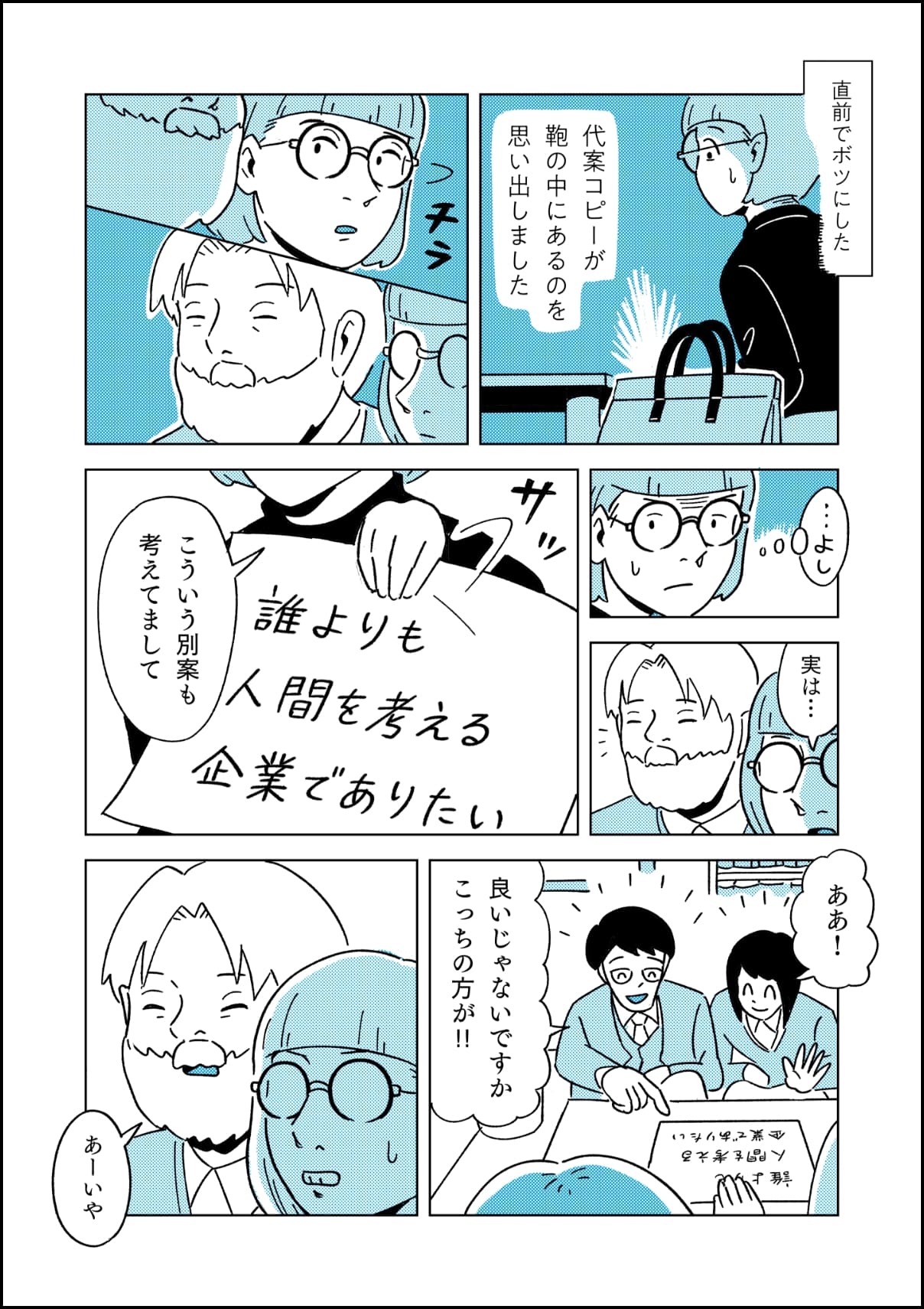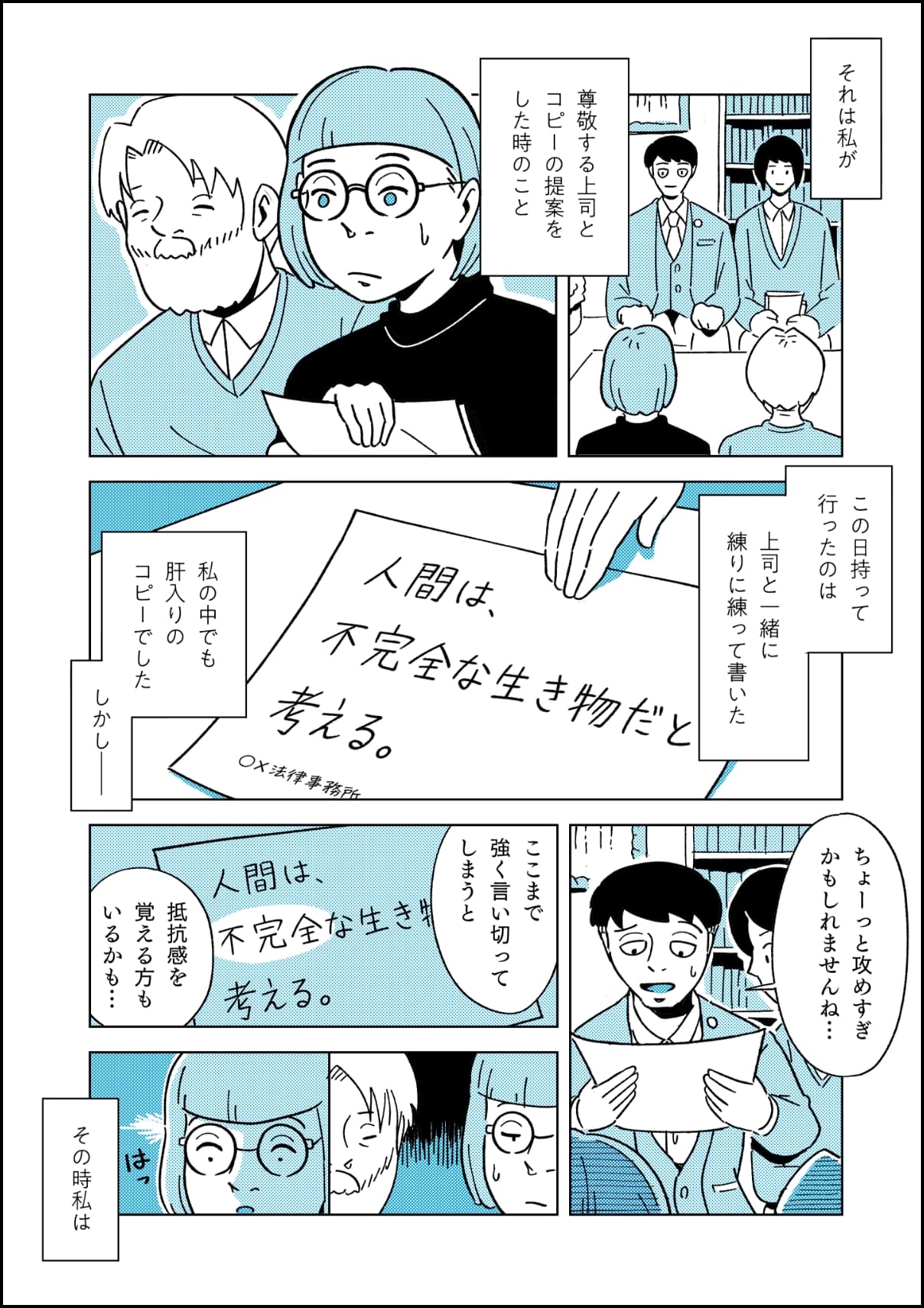 常々悩みながら仕事をしているのですが…いつでも相談できる人が社内にいるのが本当にありがたいと思っています。その時、寄り添ってくれながらも厳しい意見をいただくことがあり、その意見が自分を成長させてくれていると感じています。特に印象に残っているのは、尊敬する上司ととあるコピーの提案をしたときのエピソードです。コピーライターとして、自分の作るものにもっと自信をもてるようになりたいと強く思いました。