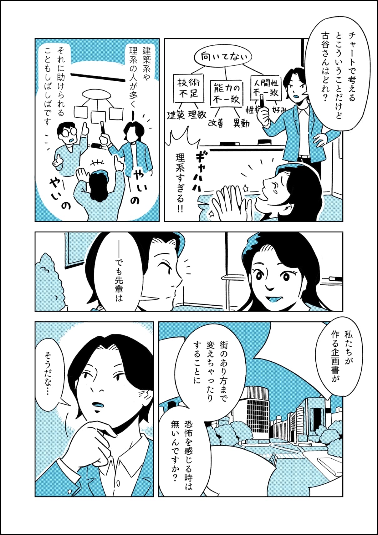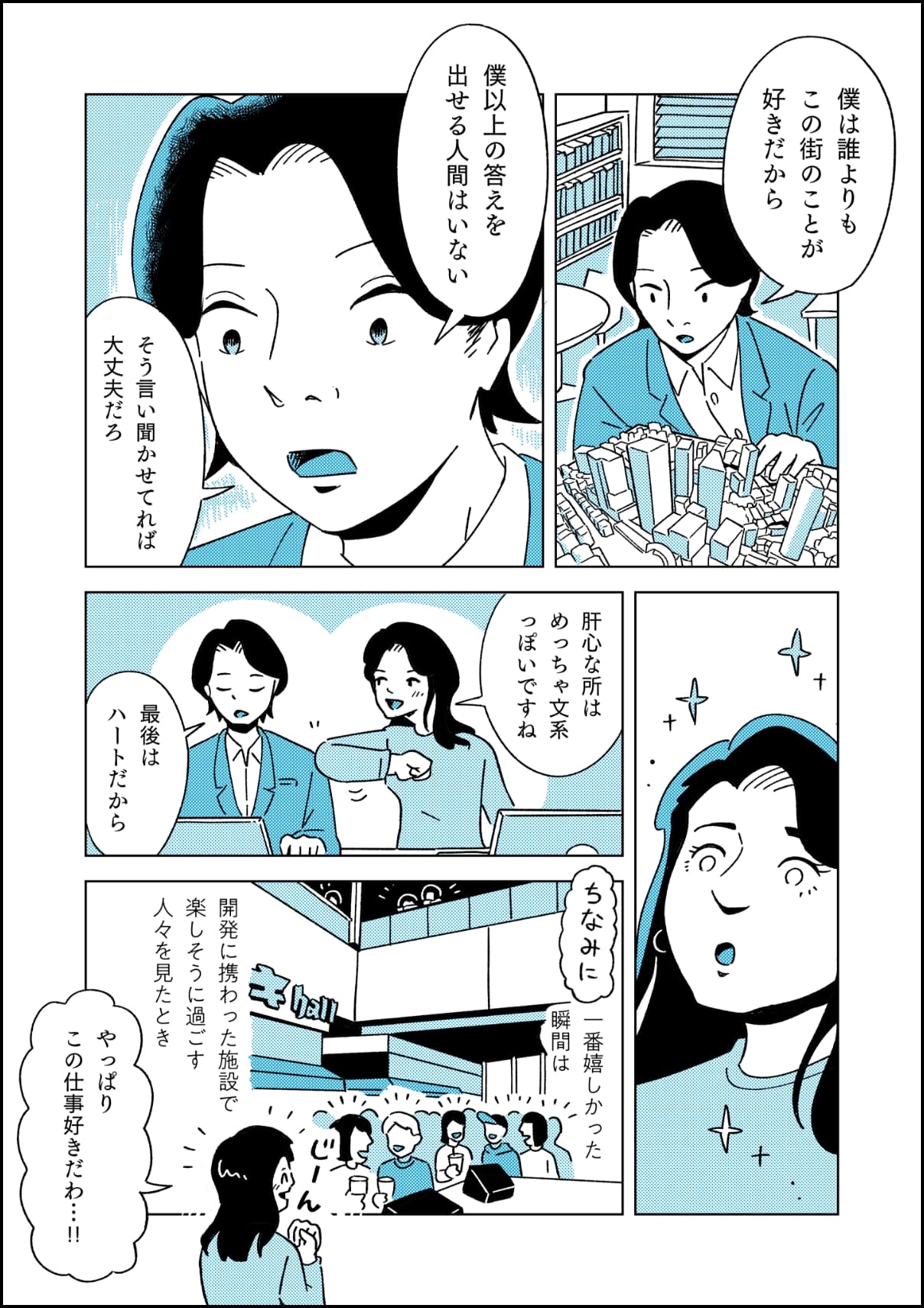 街の景観を大きく変える仕事をしているため、良くも悪くも、責任感を強く感じるようになりました。考えても考えてもまだ考えたりないと常に感じます。ですが、粘り強く悩んでいると、いずれは答えがでるということも経験上わかってきたので、今は"悩まずに悩む"ことにしています。