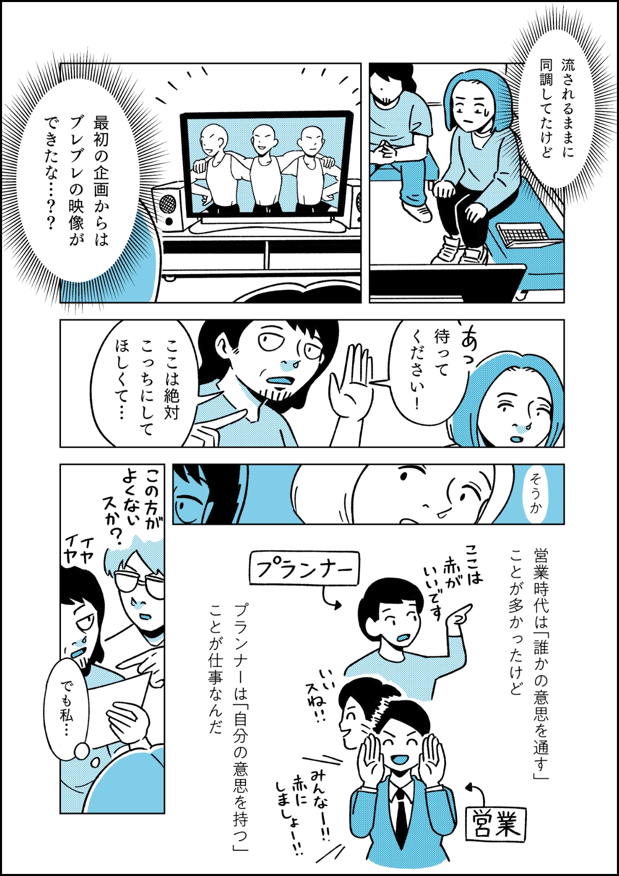 自分の意見を言えるようになったことです。もともと強く言えるほうではなく、相手に合わせている方が楽だな~と思うタチ。異動したての頃は自分のアイデアに自信が持てなかったり、ブレストの時に「私はこう思うけどみんな違うかな~」と心配になってなにも言えなかったりしていました。だけど、意見を言わずに後悔したり、逆に思いきって出したアイデアを褒められたり、「もっとこうするといいよ」と具体的にアドバイスをくれてアイデアが磨かれたり。そういった積み重ねで、だんだんと自分の意見を発信できるようになってきました。久々に営業時代の先輩と同じ案件に入ったとき、「企画面白くなったね」と言われたのがすごく嬉しかったです。