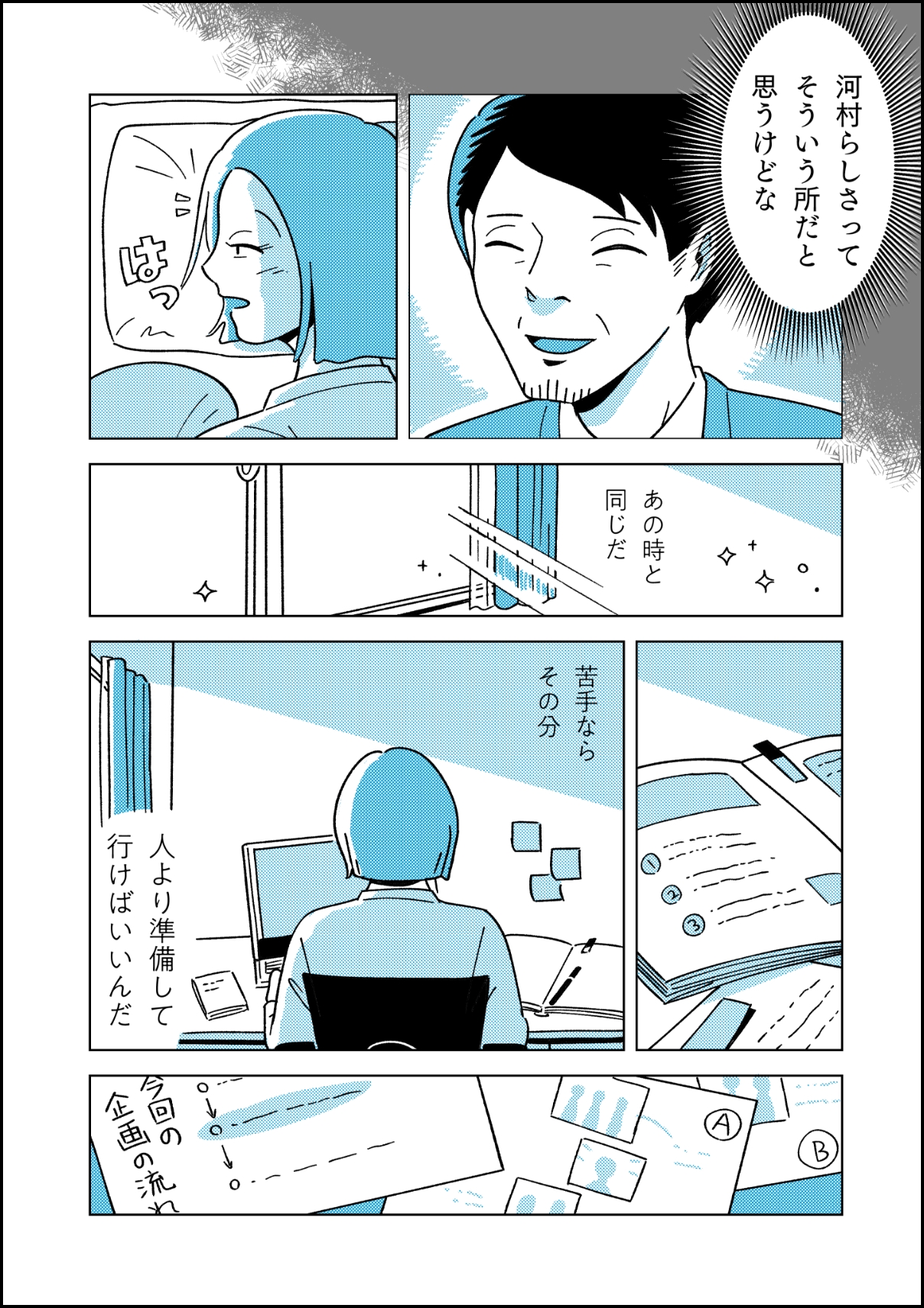 はじめて何かをするときは、毎回悩みます。そういうときは、自分が満足いくまで準備するようにしています。営業時代、自分の準備不足で、普段あまり怒らない先輩に「河村らしくないね~」と喝を入れられたのが印象的で。それ以来、特にはじめてのことに対しては「これで大丈夫!」と思えるまで準備をするようにしています。資料をみてくれたり、壁打ちに付き合ってくれたり、準備に付き合ってくれる先輩も多くて感謝ですね。