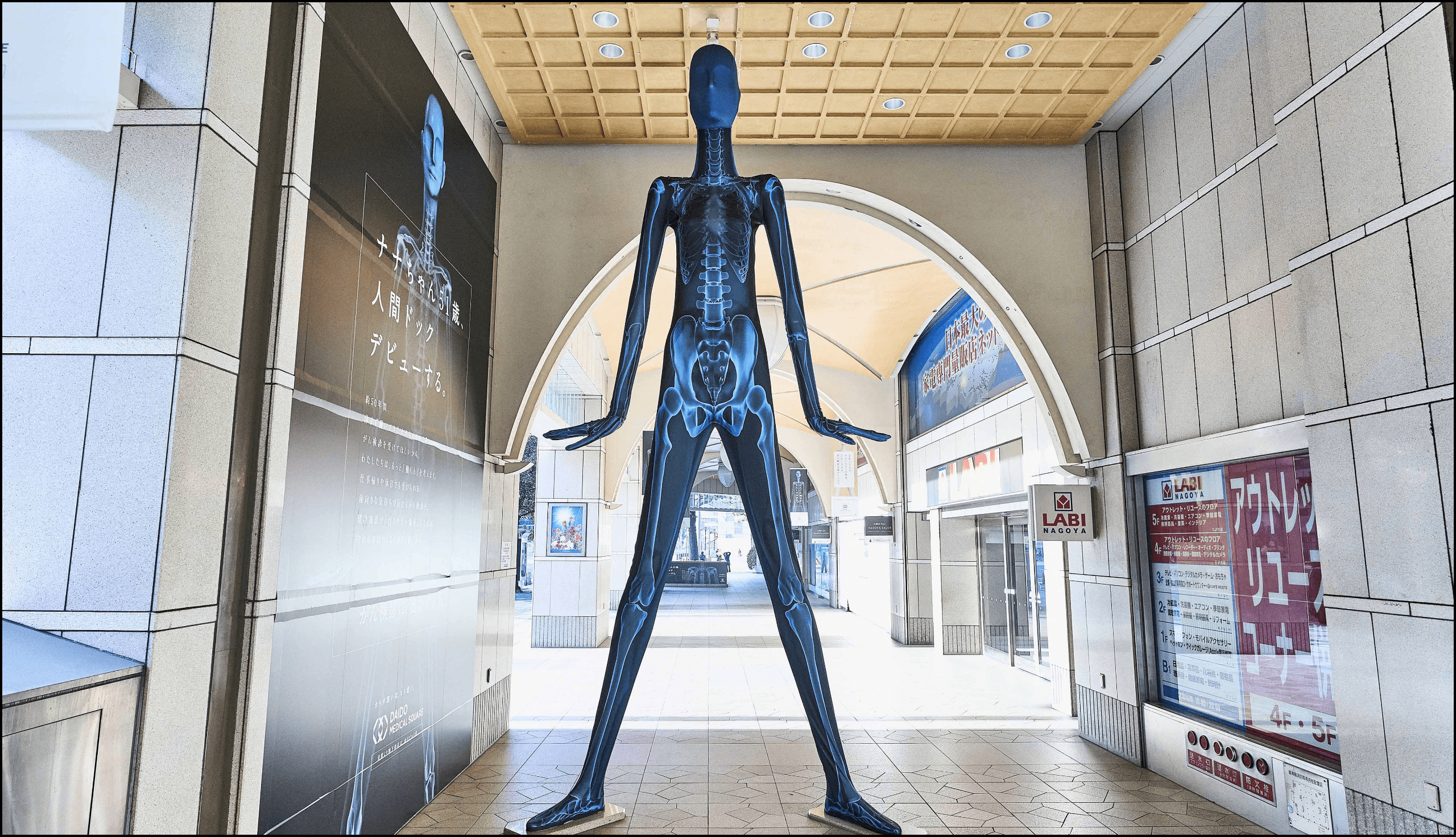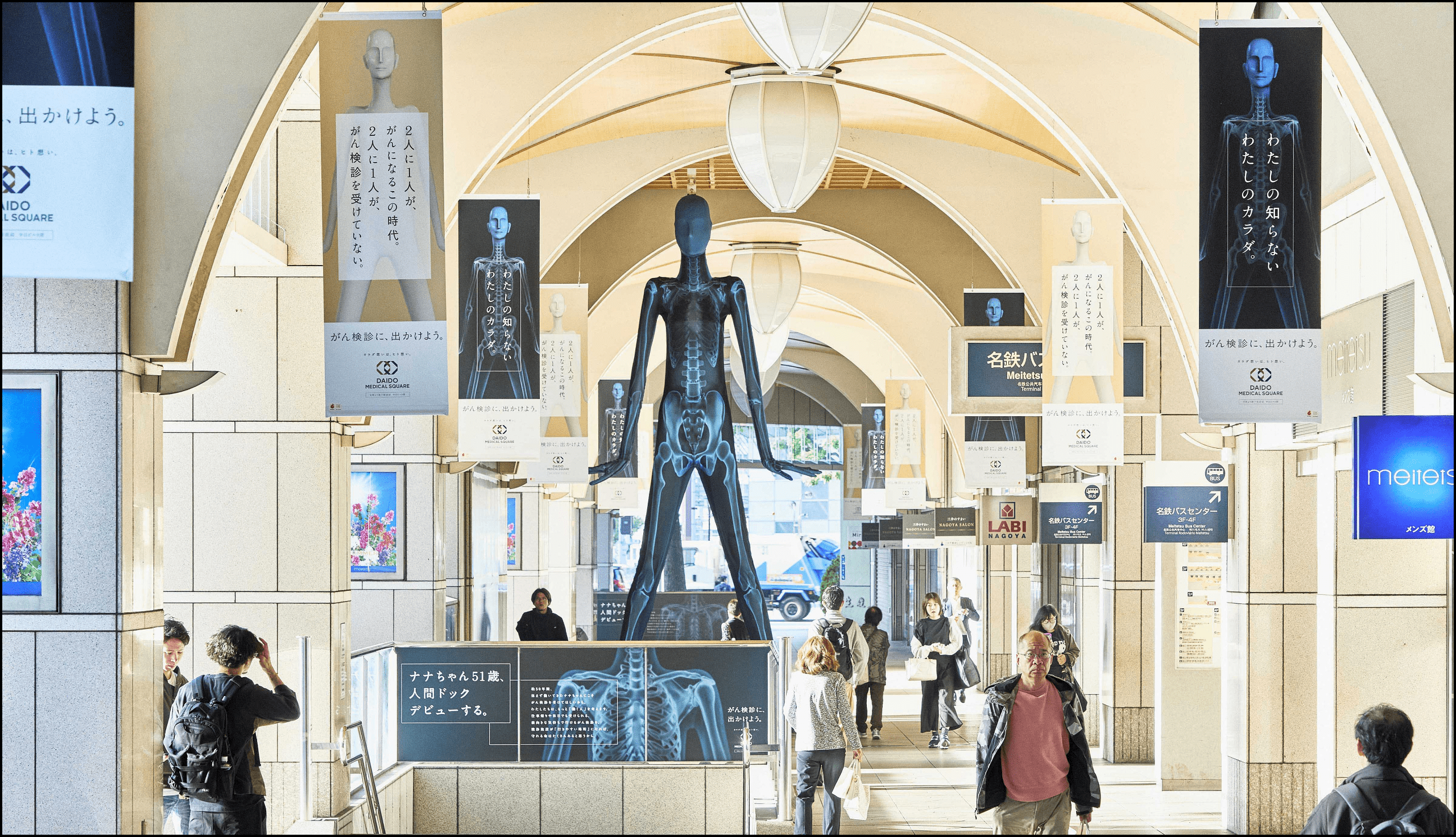 DAIDO MEDICAL SQUAREは、名古屋にオープンした働く人のための健診施設。その認知拡大のために、名古屋で有名な「ナナちゃん」を活用した。「ナナちゃん」とは、51年前から名古屋駅前にある巨大な像のこと。つまり、彼女は51歳でターゲットのど真ん中。名古屋で有名な像を「がん検診を受けたことがない一人の女性」ととらえ、「人生初の人間ドックデビュー」として、ナナちゃんのレントゲン姿を初公開した。